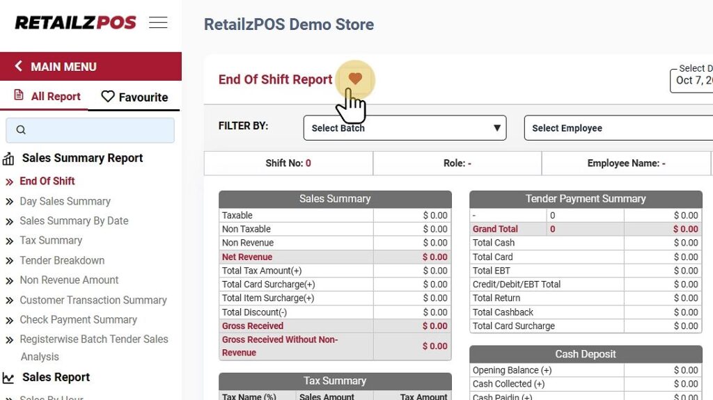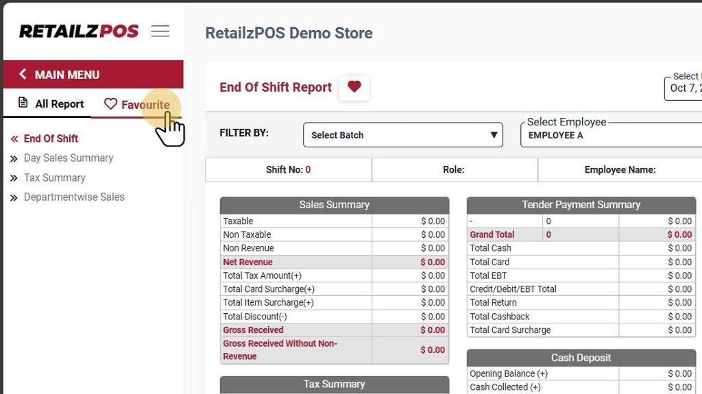 The End of Shift Report provides an overview of all sales occurring in your store. It offers detailed information on cash collected, tax amounts, lottery, department sales, sales by tender, and other deposits.