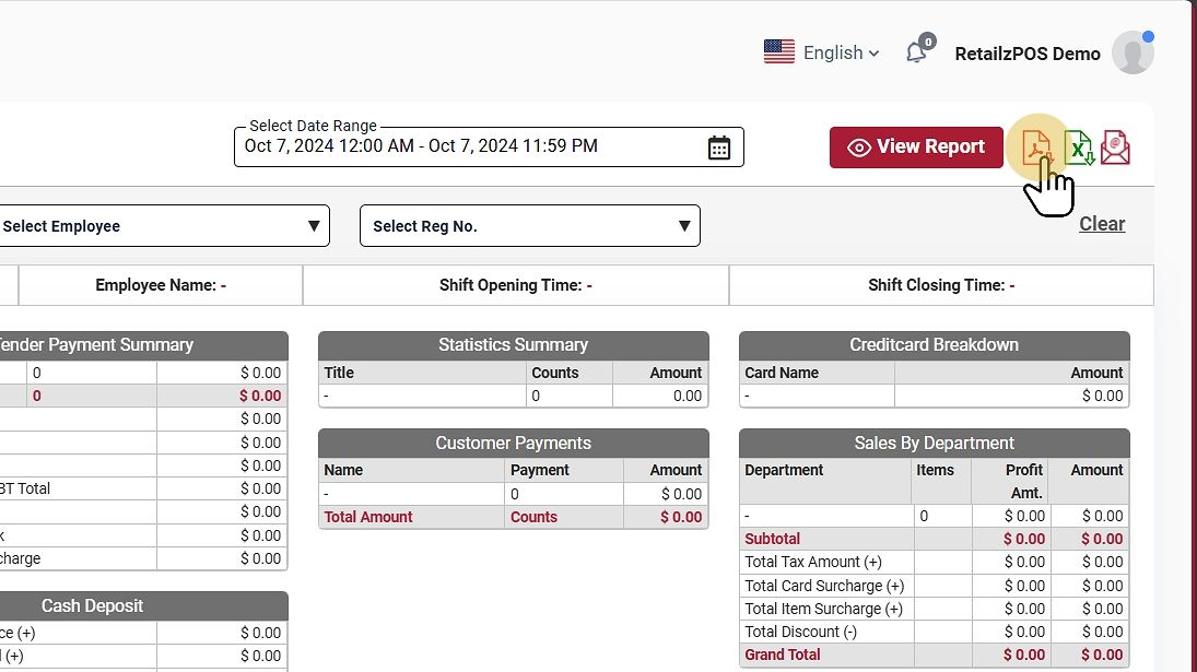 The End of Shift Report provides an overview of all sales occurring in your store. It offers detailed information on cash collected, tax amounts, lottery, department sales, sales by tender, and other deposits.
