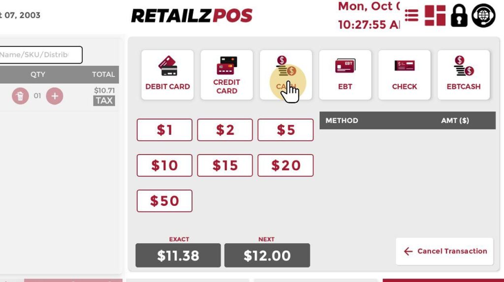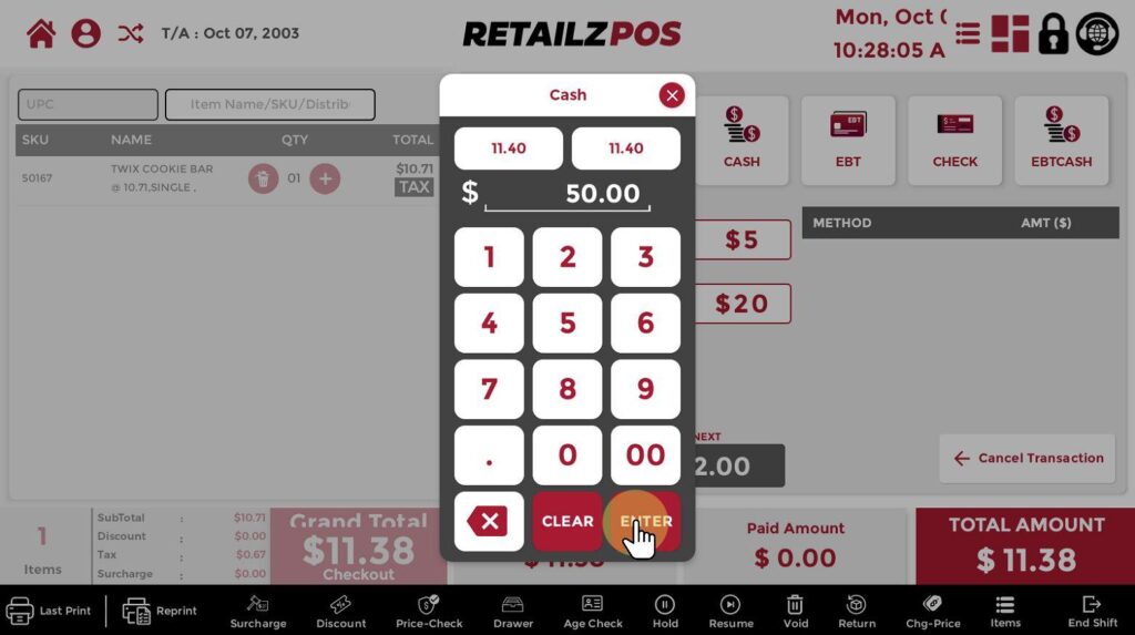 Note: You can use the keypad and fast cash buttons directly on the cash register screen to process cash payments quickly. Additionally, you can select the card button to proceed with card transactions without navigating through the grand total menu.