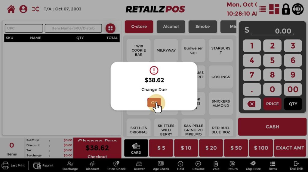 Once the transaction is complete, the Change Due will be displayed on the screen.