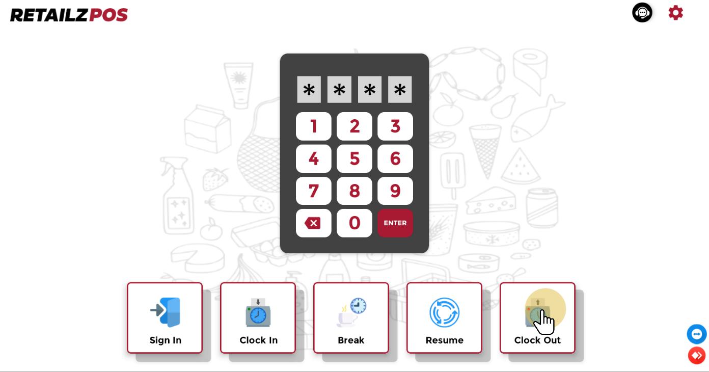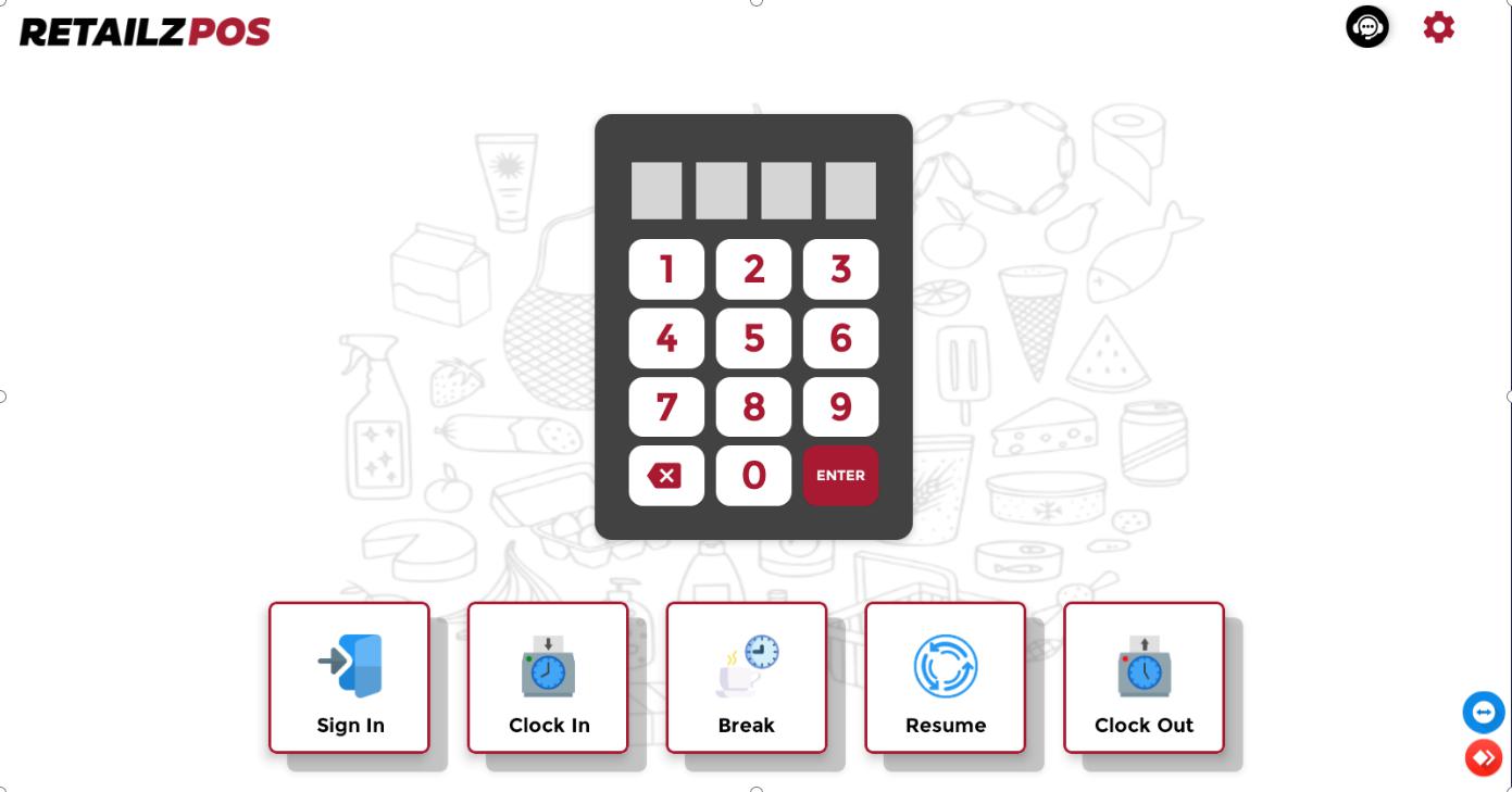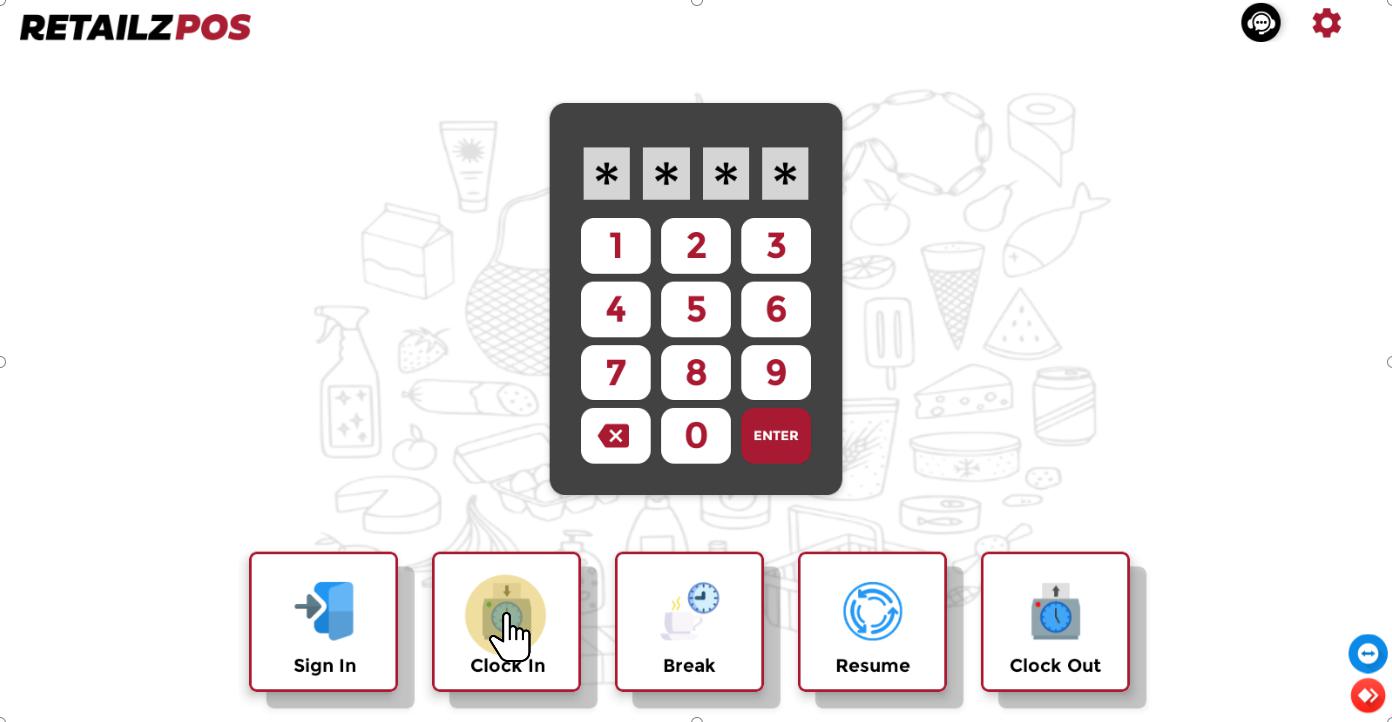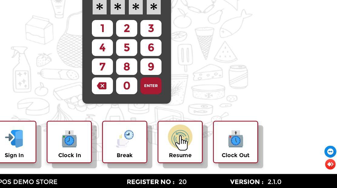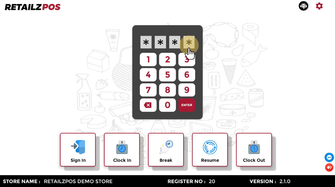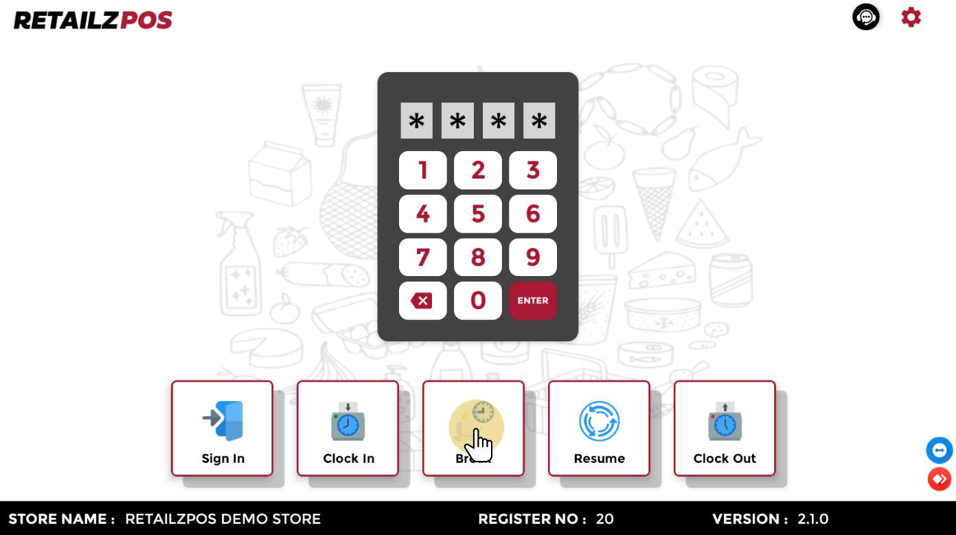 The login screen is used for opening shifts, clocking in and out employees, and managing break times (Break and resume).