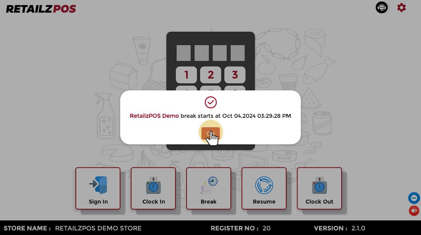 Note: If an employee is already on break, a popup will say “Please first click Resume to log in.”