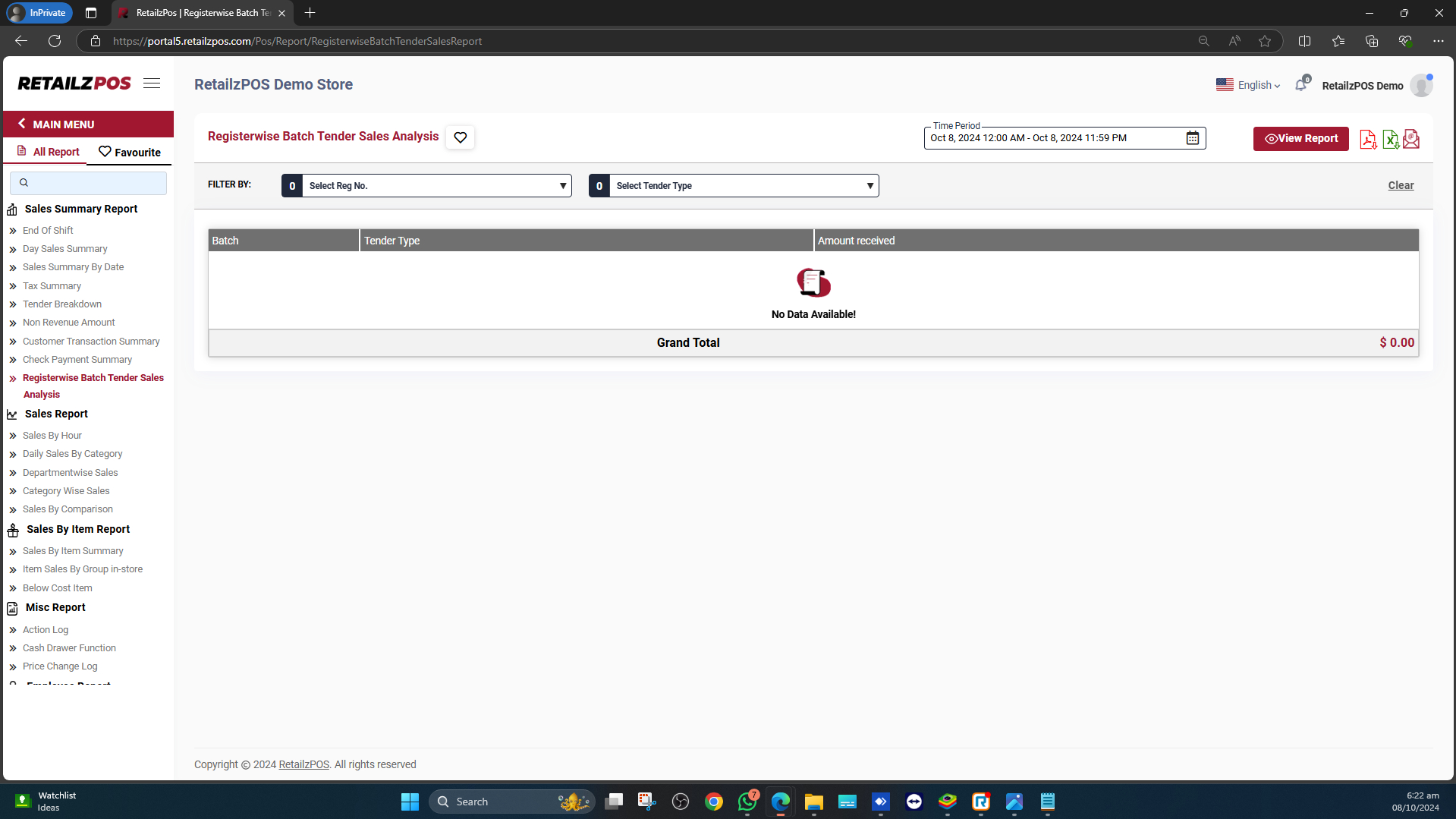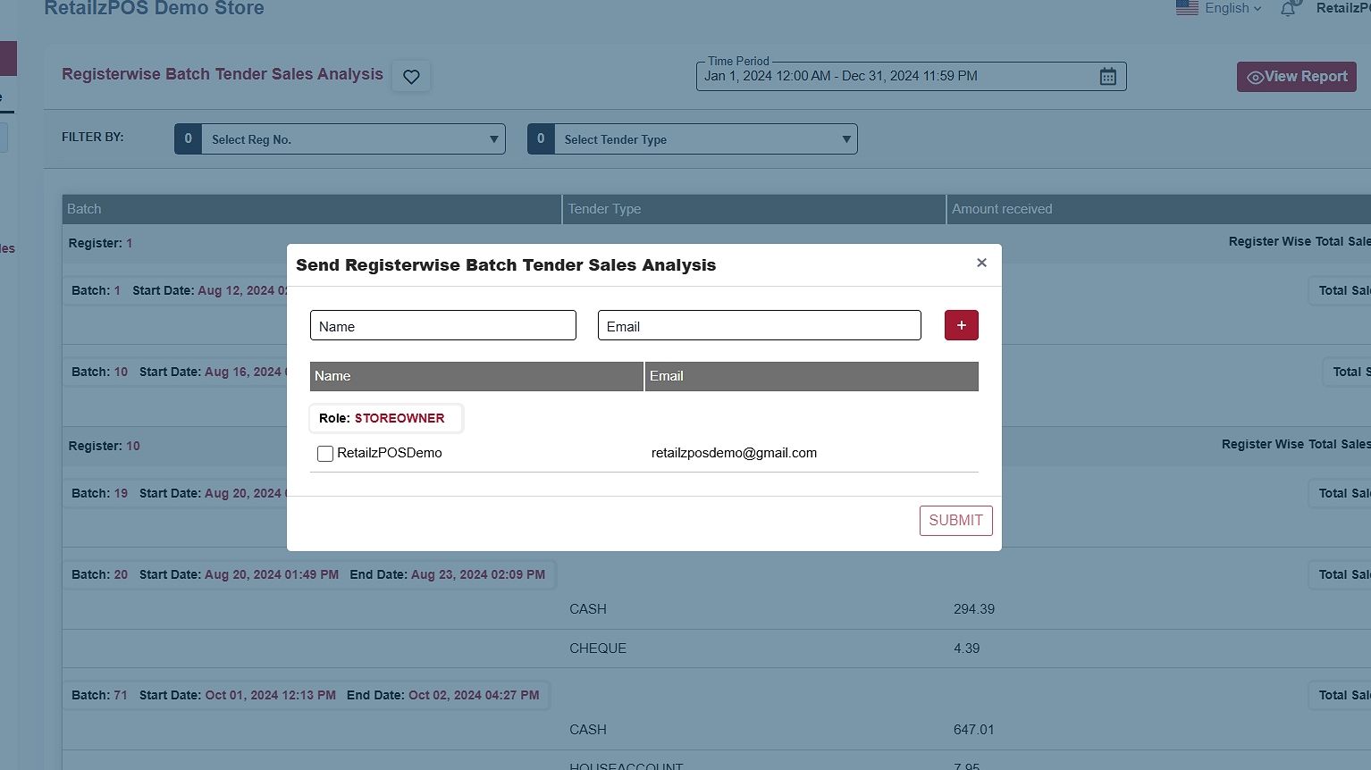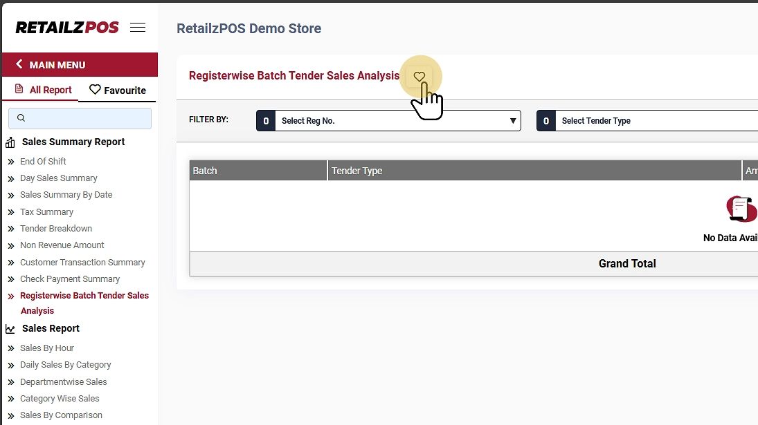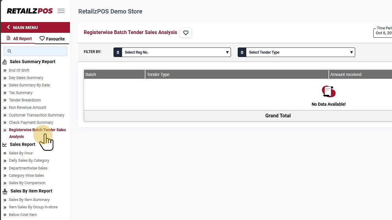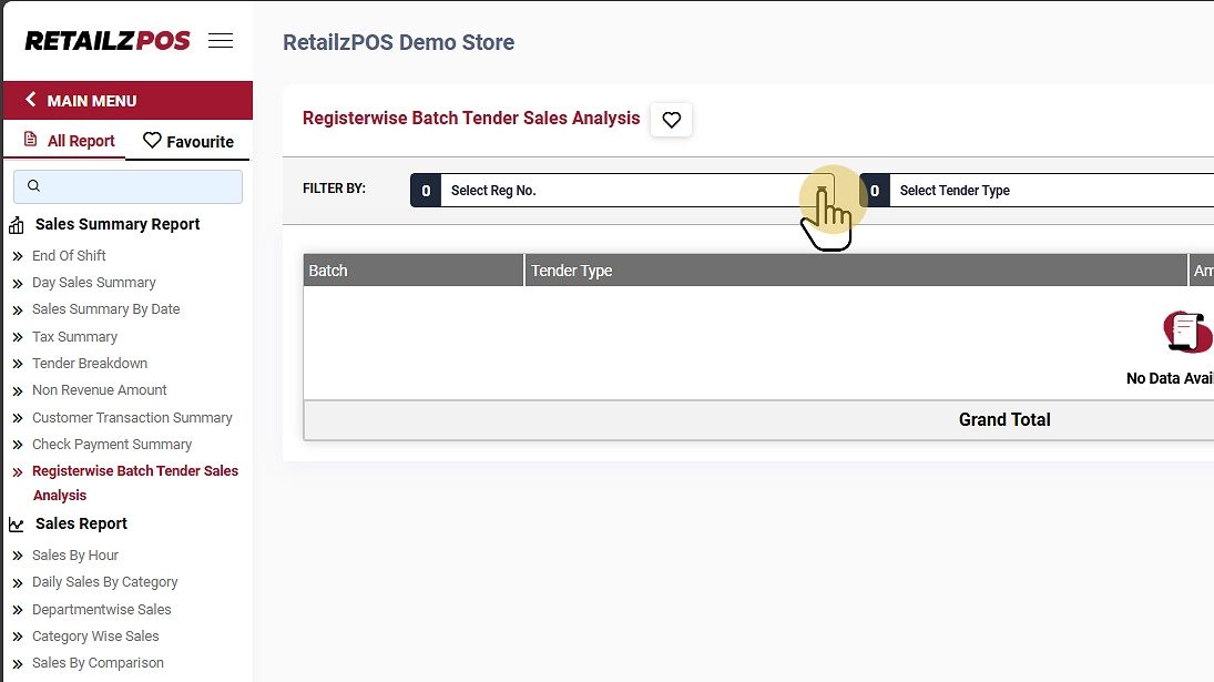 Select Registerwise Batch Tender Sales Analysis under the Sales Summary Report section.