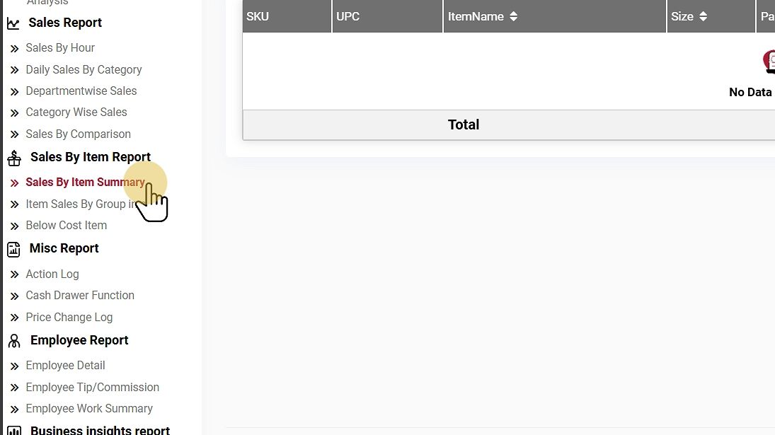 Select the Sales By Item Summary under the Sales Summary Report section.