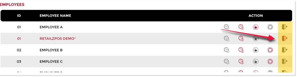 From the bottom half of the Time Card screen, you are able to see the “Employees” Section where you can find the employee names and on the right side, the action buttons you can do.